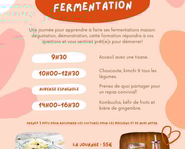 La formation se découpe en deux parties: la choucroute, le kimchi et tous les légumes le matin. Le kombucha, le kéfir de fruit et la bière de gingembre l'après-midi. Apportez de quoi partager pour le repas de midi, ce sera auberge espagnole! Il est possible de venir seulement le matin ou seulement l'après-midi.