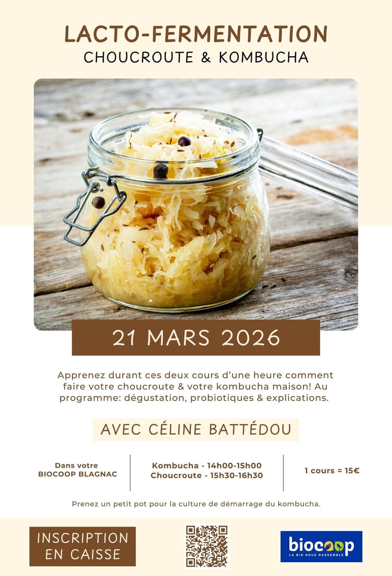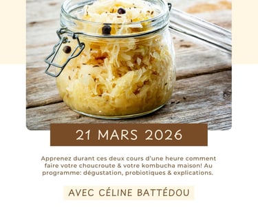 Découvrez les délices et les vertus qui se cachent derrière la lacto-fermentation. Apprenez les méthodes appropriées pour pouvoir réaliser la choucroute traditionnelle ainsi que des variantes chez vous, ainsi que la boisson "kombucha". Vous aurez l’occasion de goûter des échantillons et de poser toutes vos questions!